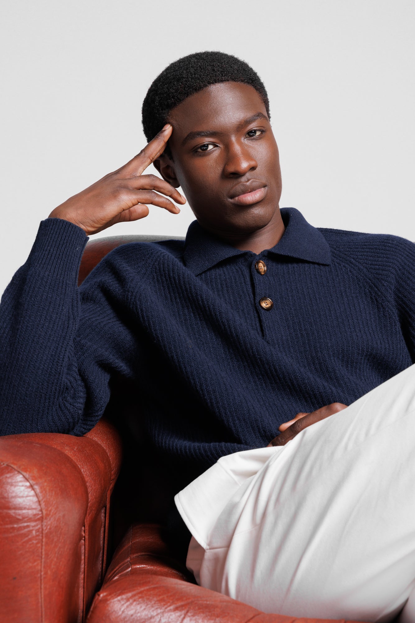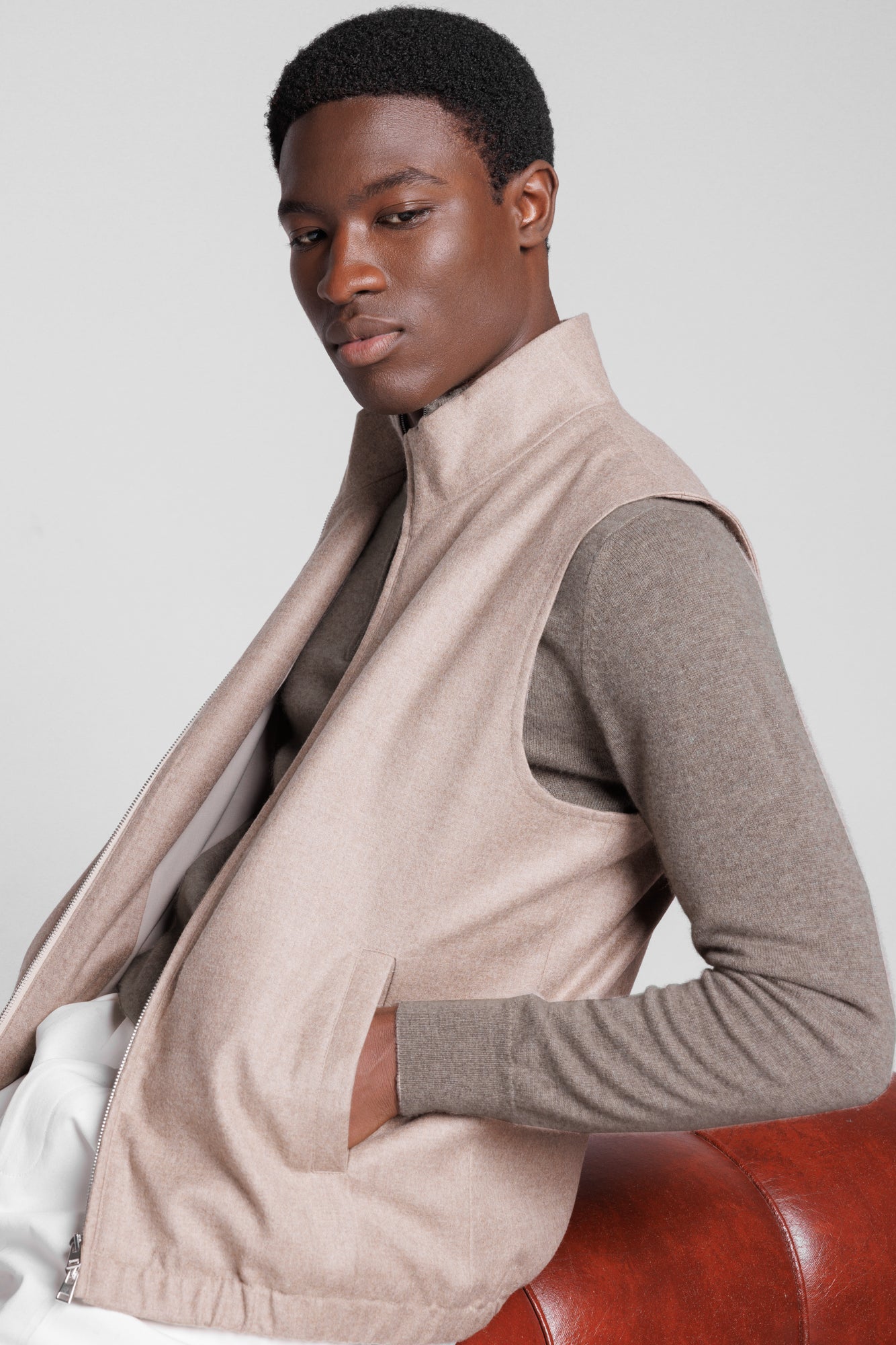 Ontwikkeld voor de essentiële pijlers van de herengarderobe — rondhals, mock neck, polo met knopen van echte parelmoer, hoodie en het nieuwe cardigan met echte hoornknopen — verheft dit garen alledaagse knitwear tot uitingen van ingetogen, tijdloze luxe, waar materiaal en constructie met een stille maar gezaghebbende stem spreken.