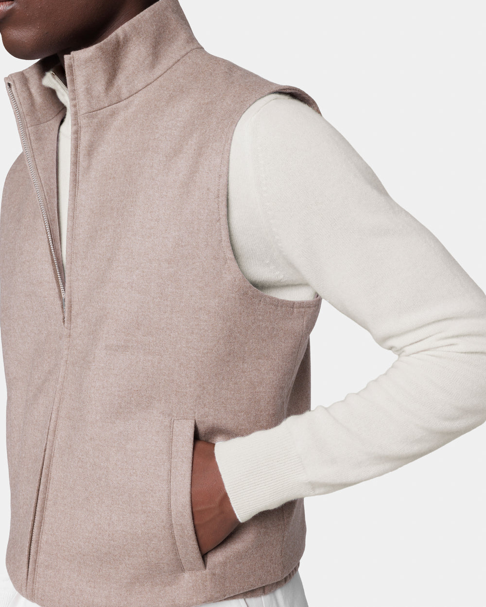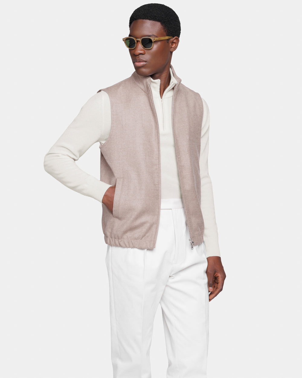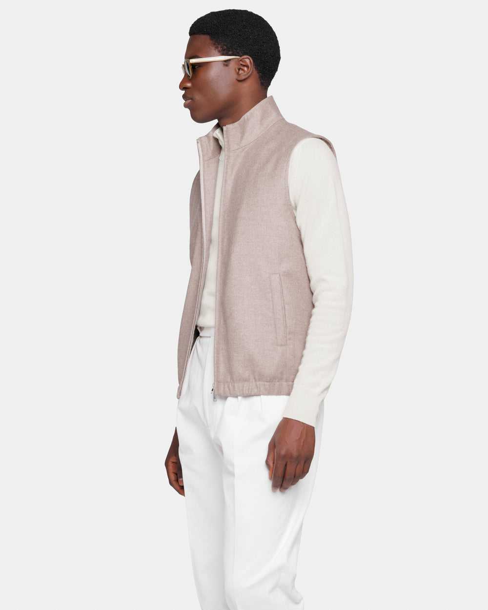 Maatwerk gilet in zand waterafstotend 95% wol en 5% kasjmier, ongevoerd en niet gewatteerd, met opstaande kraag en metalen ritssluiting met dubbele schuiver, ontworpen voor perfecte gelaagdheid en hoge functionaliteit in de hedendaagse garderobe.