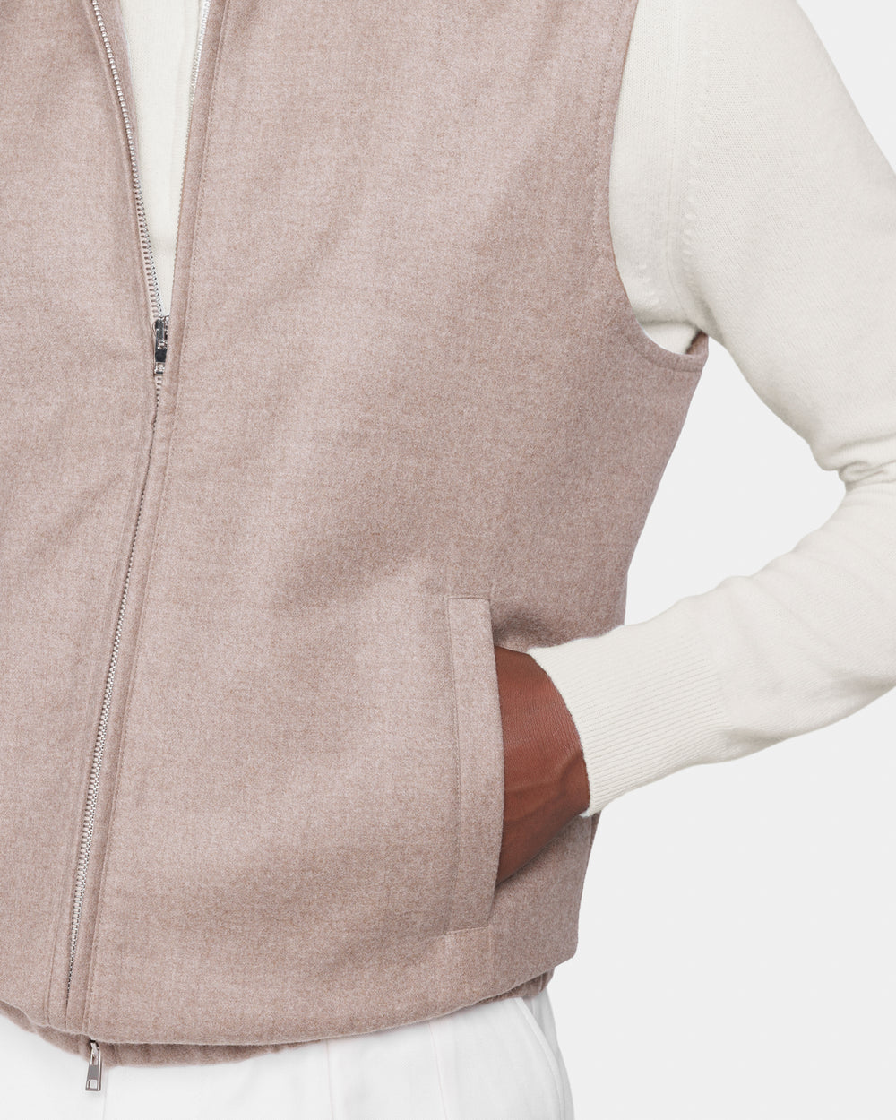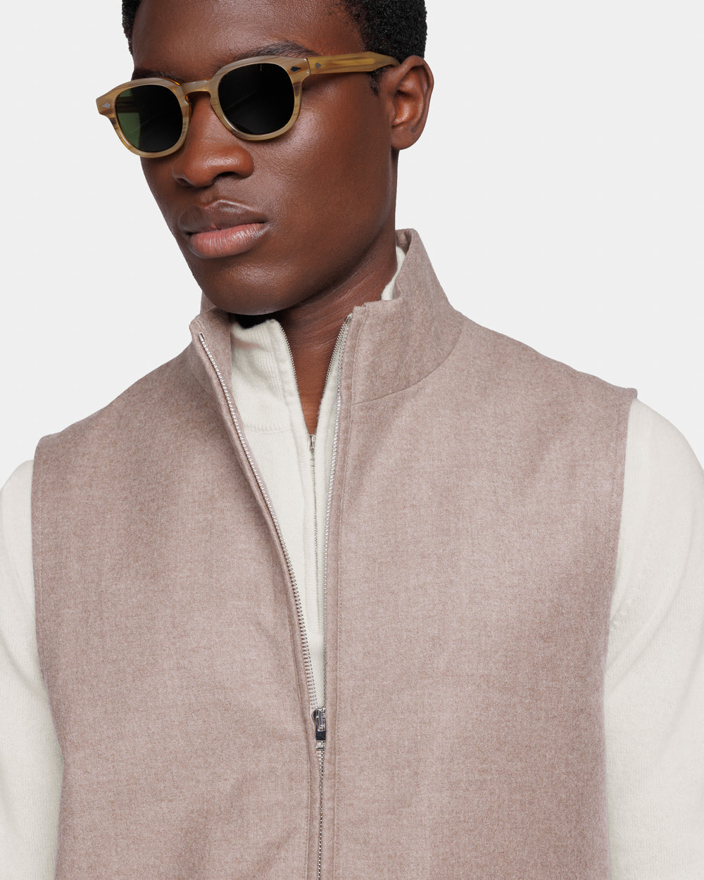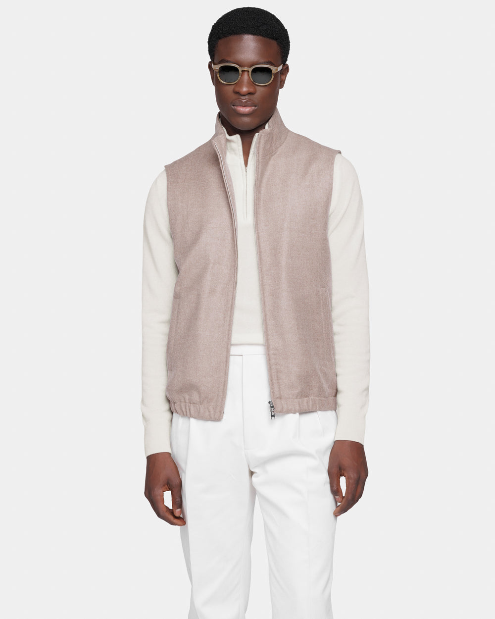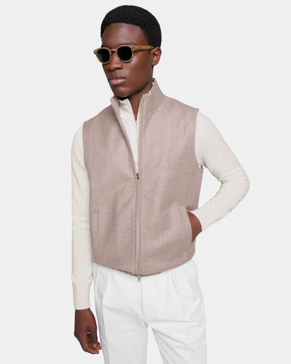 Maatwerk gilet in zand waterafstotend 95% wol en 5% kasjmier, ongevoerd en niet gewatteerd, met opstaande kraag en metalen ritssluiting met dubbele schuiver, ontworpen voor perfecte gelaagdheid en hoge functionaliteit in de hedendaagse garderobe.