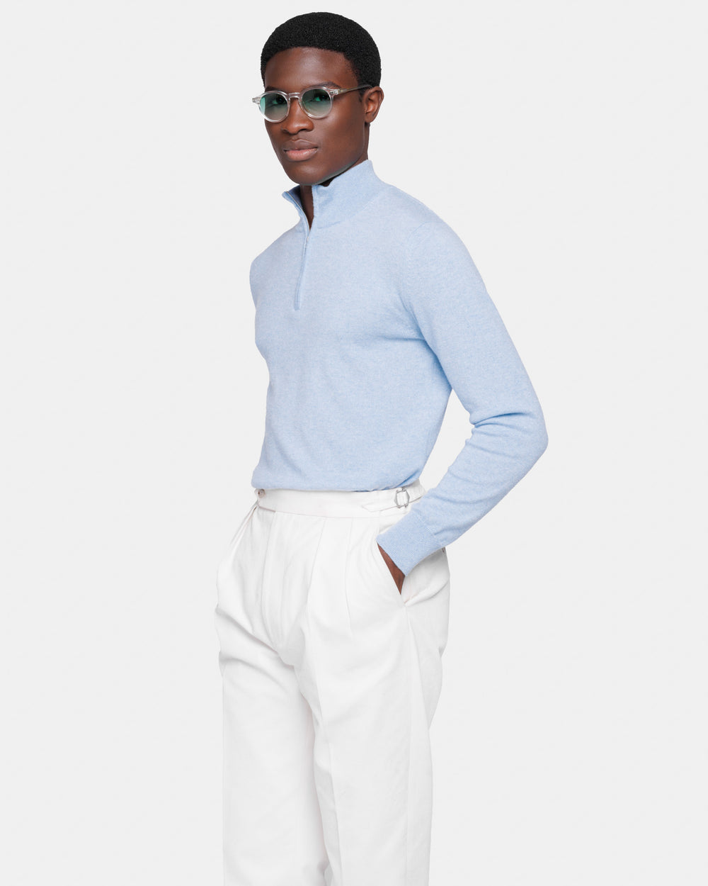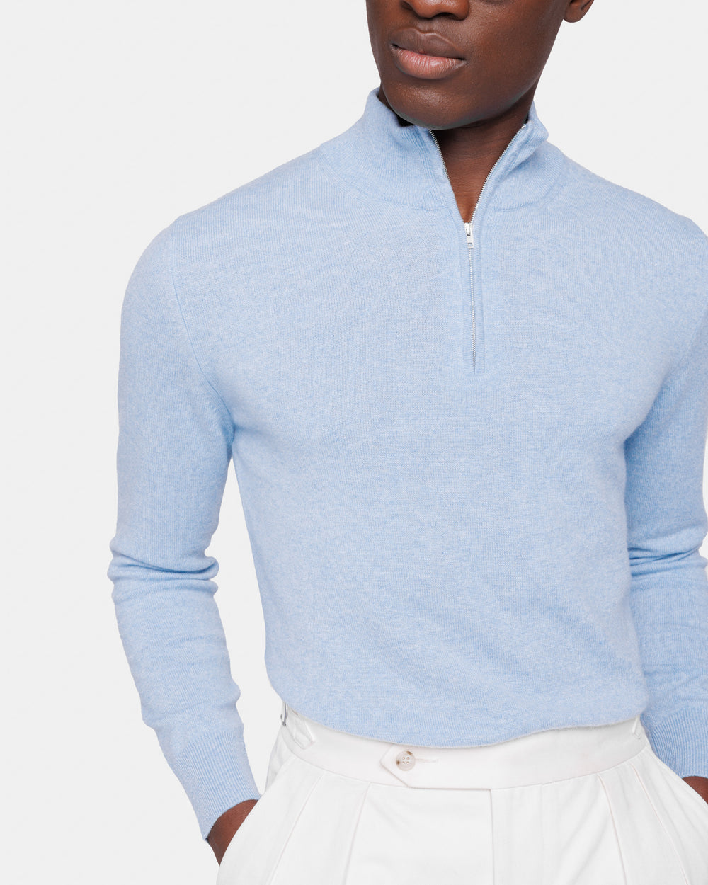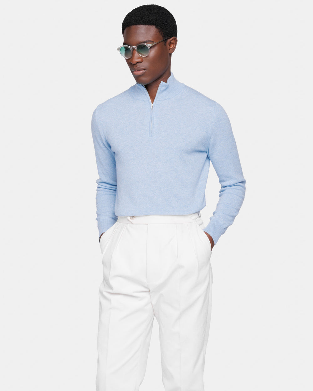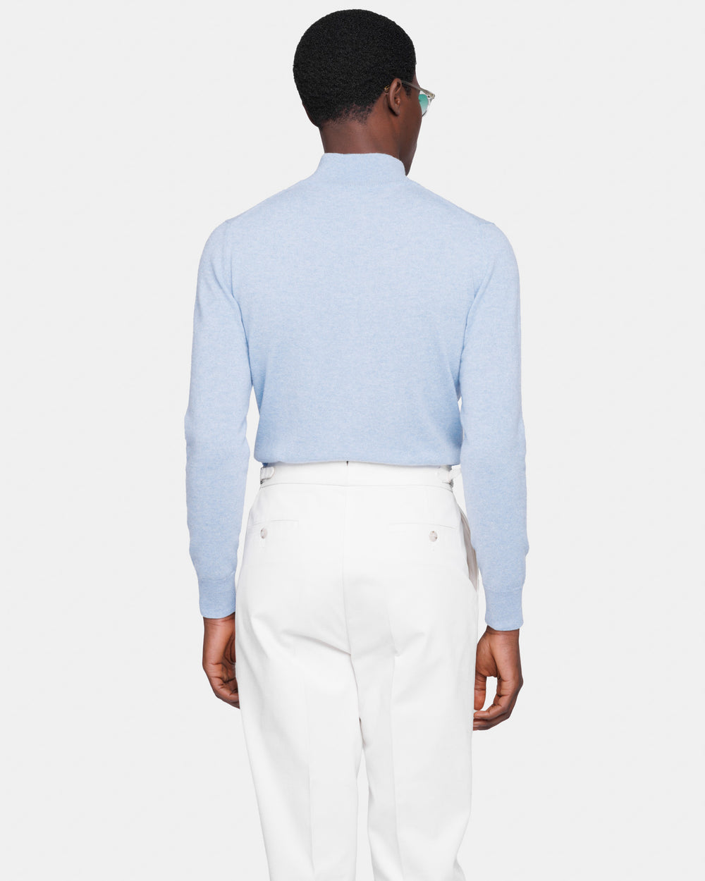 Op maat gemaakte trui in 1-draads garen met titel 2/27, lange mouwen, effen hemelsblauw, met opstaande col en 20 cm Riri-rits, vervaardigd uit een exclusieve, verfijnde en ultrafijne vezel van puur Cashmere Crown Reserve. Deze kasjmier is afkomstig uit de meest afgelegen regio’s van Mongolië en wordt vervolgens in de ateliers van Quarona Sesia, in Piemonte, vakkundig verwerkt door de meest prestigieuze spinnerij ter wereld tot een gekaard garen van titel 2/27.