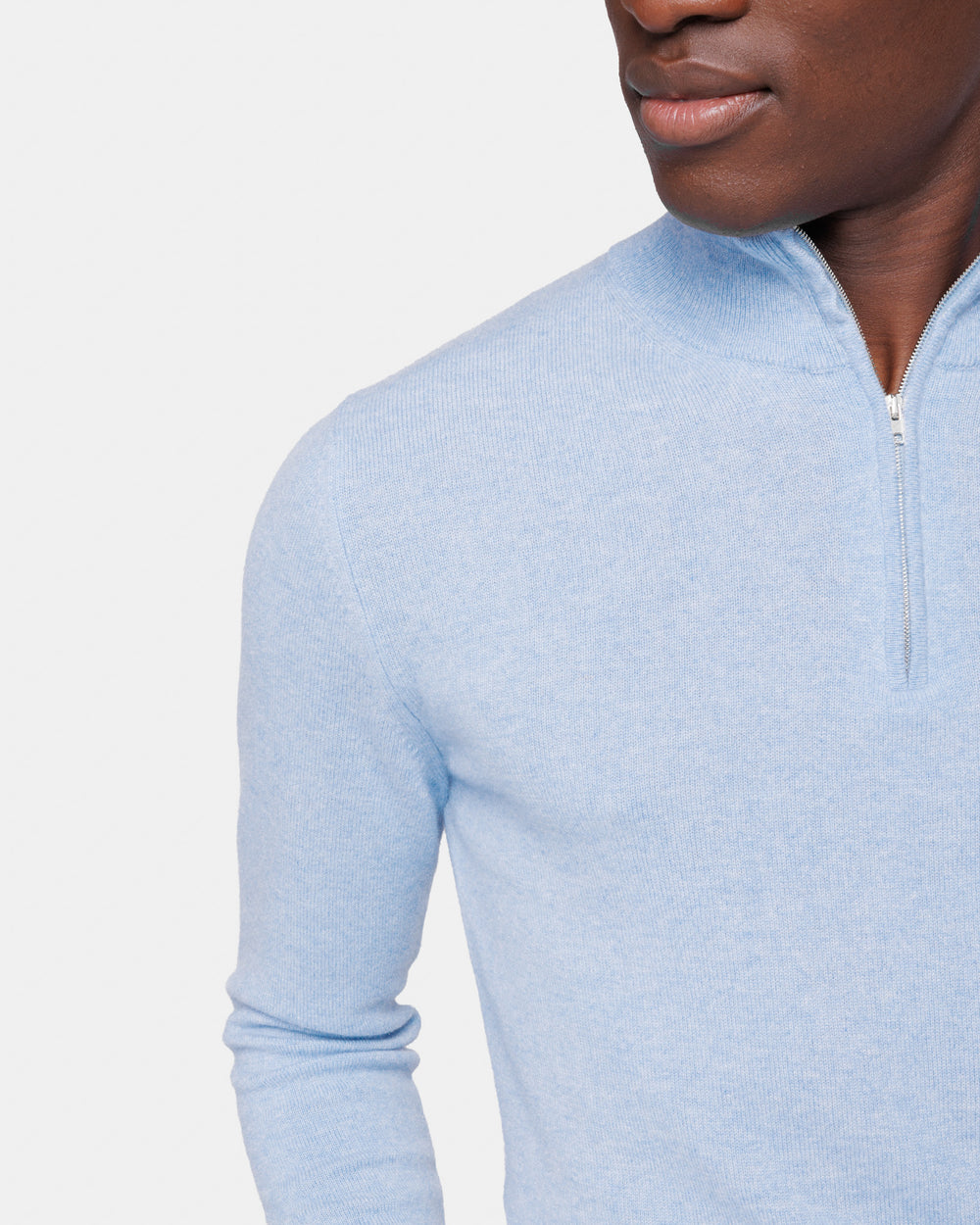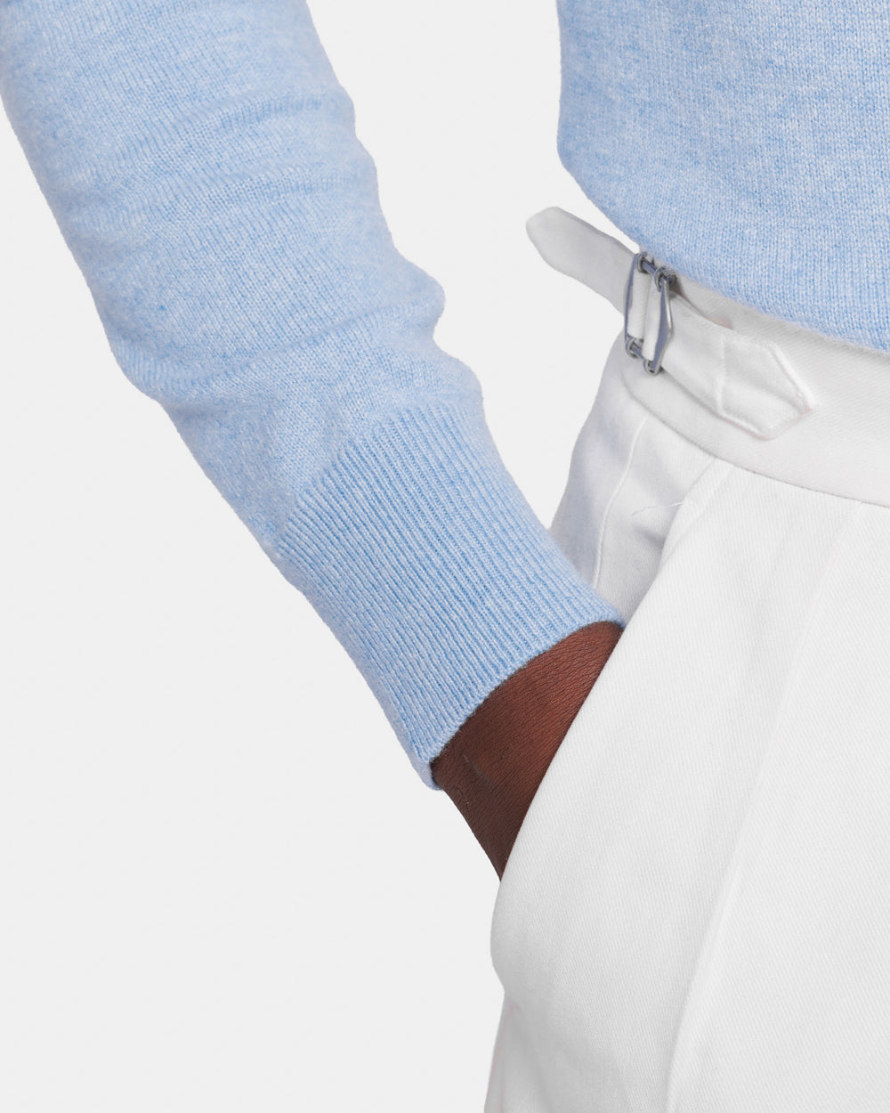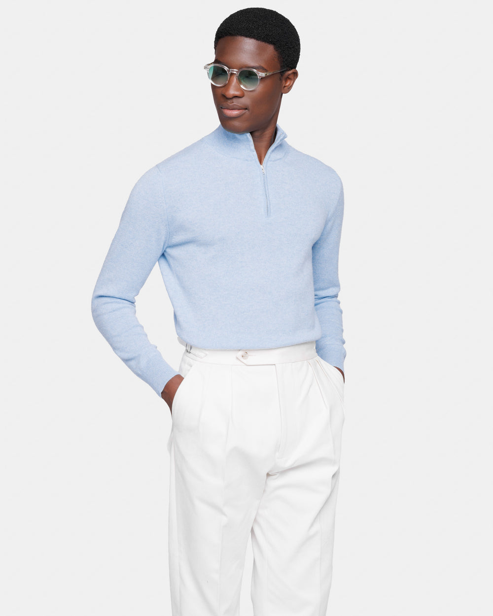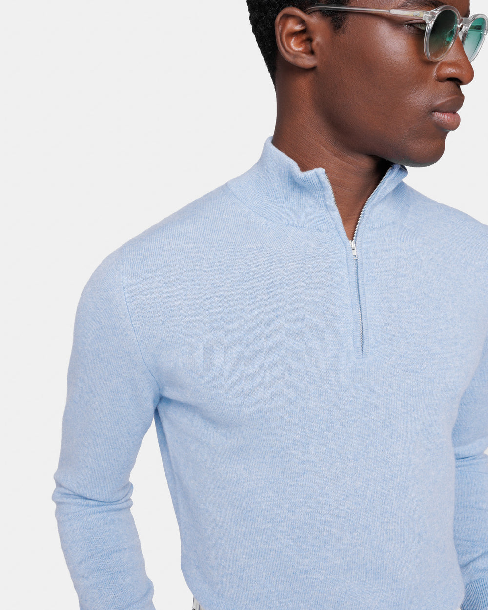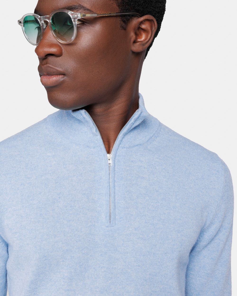Op maat gemaakte trui in 1-draads garen met titel 2/27, lange mouwen, effen hemelsblauw, met opstaande col en 20 cm Riri-rits, vervaardigd uit een exclusieve, verfijnde en ultrafijne vezel van puur Cashmere Crown Reserve. Deze kasjmier is afkomstig uit de meest afgelegen regio’s van Mongolië en wordt vervolgens in de ateliers van Quarona Sesia, in Piemonte, vakkundig verwerkt door de meest prestigieuze spinnerij ter wereld tot een gekaard garen van titel 2/27.