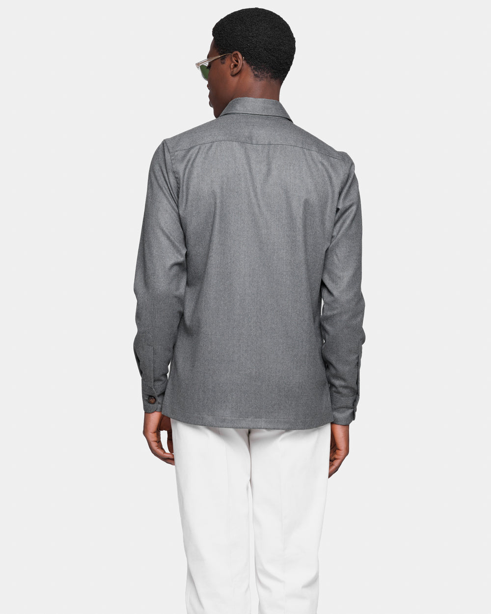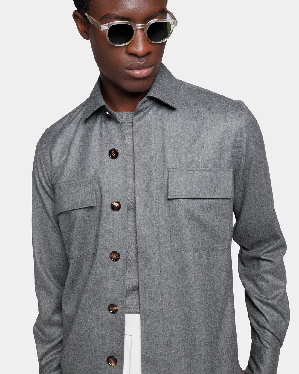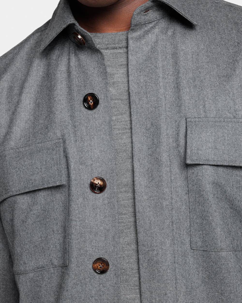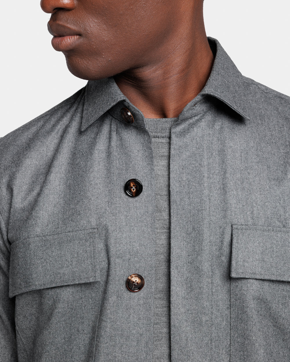 Op maat gemaakte overshirt in effen grijs met authentieke buffelhoornknopen van 32 mm, vervaardigd uit de hoogwaardige Australische Saxon Merino “Intrepid” Super 150’s wol van Lanificio Vitale Barberis Canonico, een symbool van de Italiaanse topkwaliteit in de productie van fijne wol.