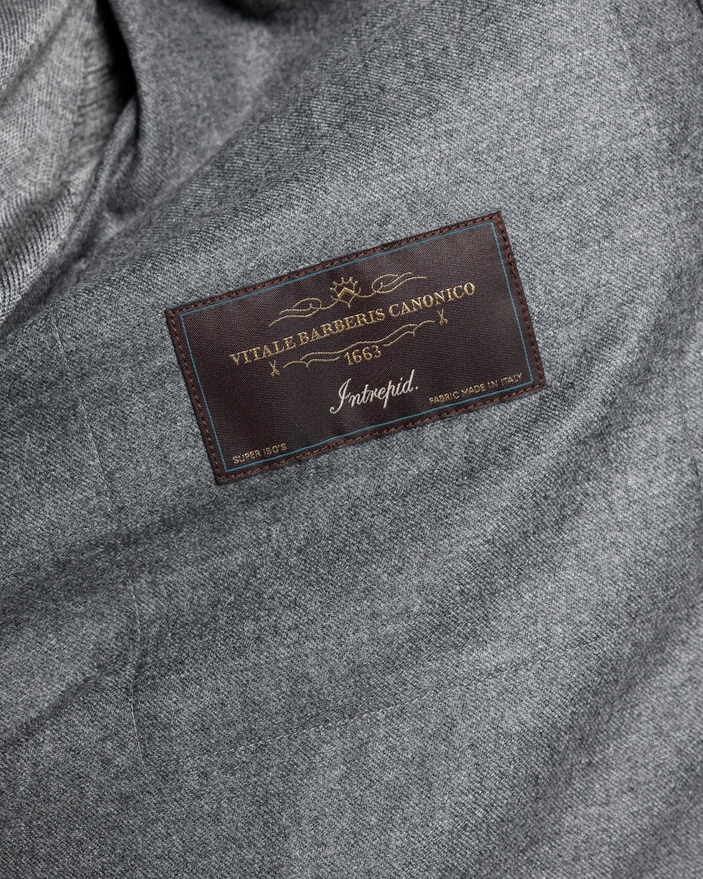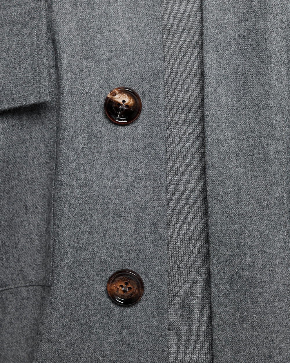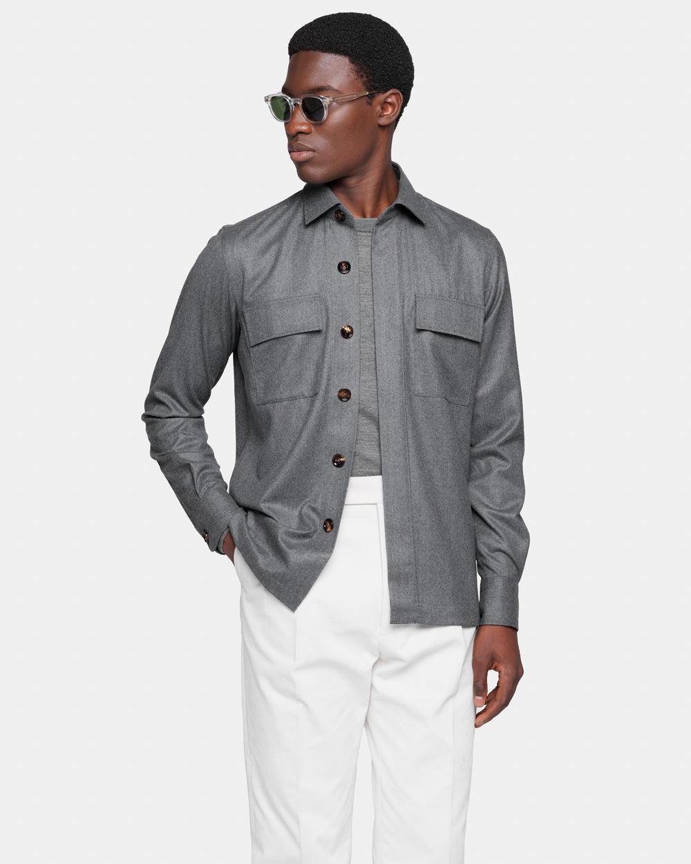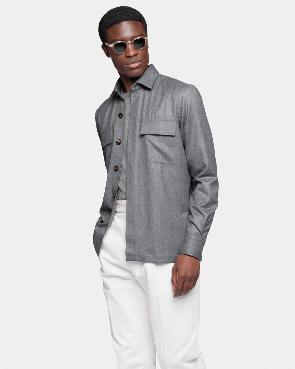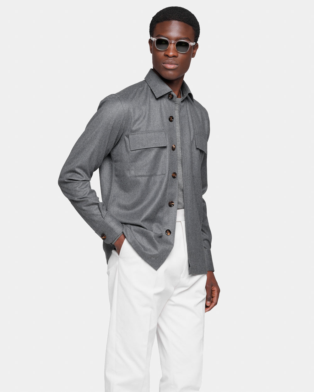 Op maat gemaakte overshirt in effen grijs met authentieke buffelhoornknopen van 32 mm, vervaardigd uit de hoogwaardige Australische Saxon Merino “Intrepid” Super 150’s wol van Lanificio Vitale Barberis Canonico, een symbool van de Italiaanse topkwaliteit in de productie van fijne wol.