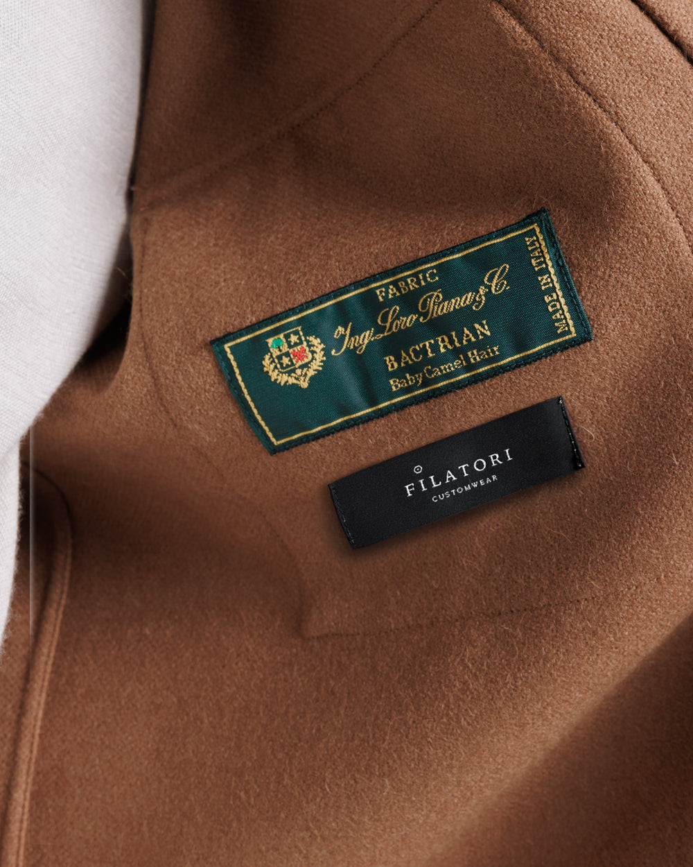 De stof Bactrian 100% Baby Camel Hair van Loro Piana, gemaakt in Italië, is een van de hoogste uitingen van Italiaans textielvakmanschap. Afkomstig van de eerste vacht van de Bactrische kameel, op natuurlijke wijze verzameld tijdens de rui, is het een uiterst zeldzame vezel: extreem fijn en zacht, vergelijkbaar met de beste kasjmier, maar duurzamer.