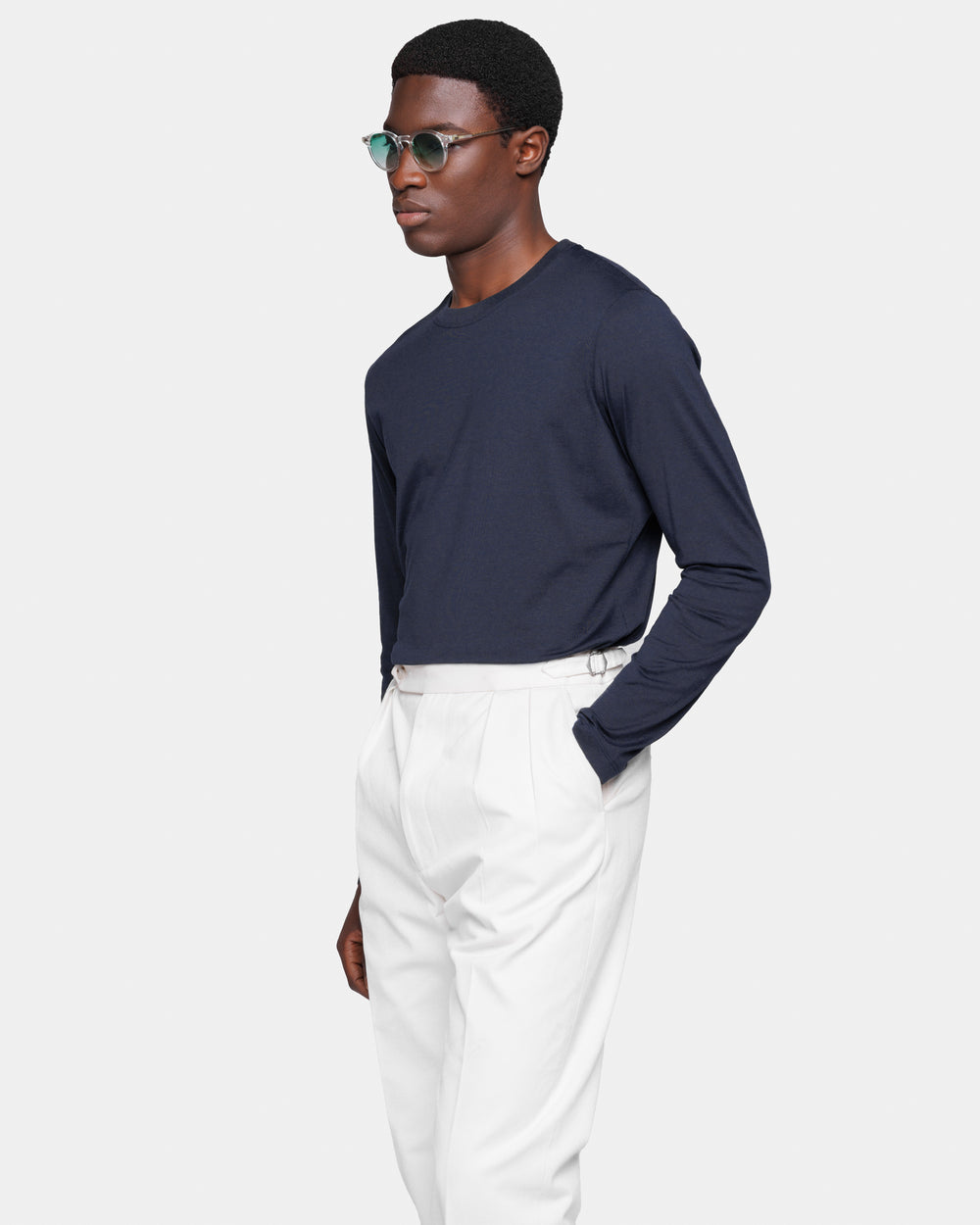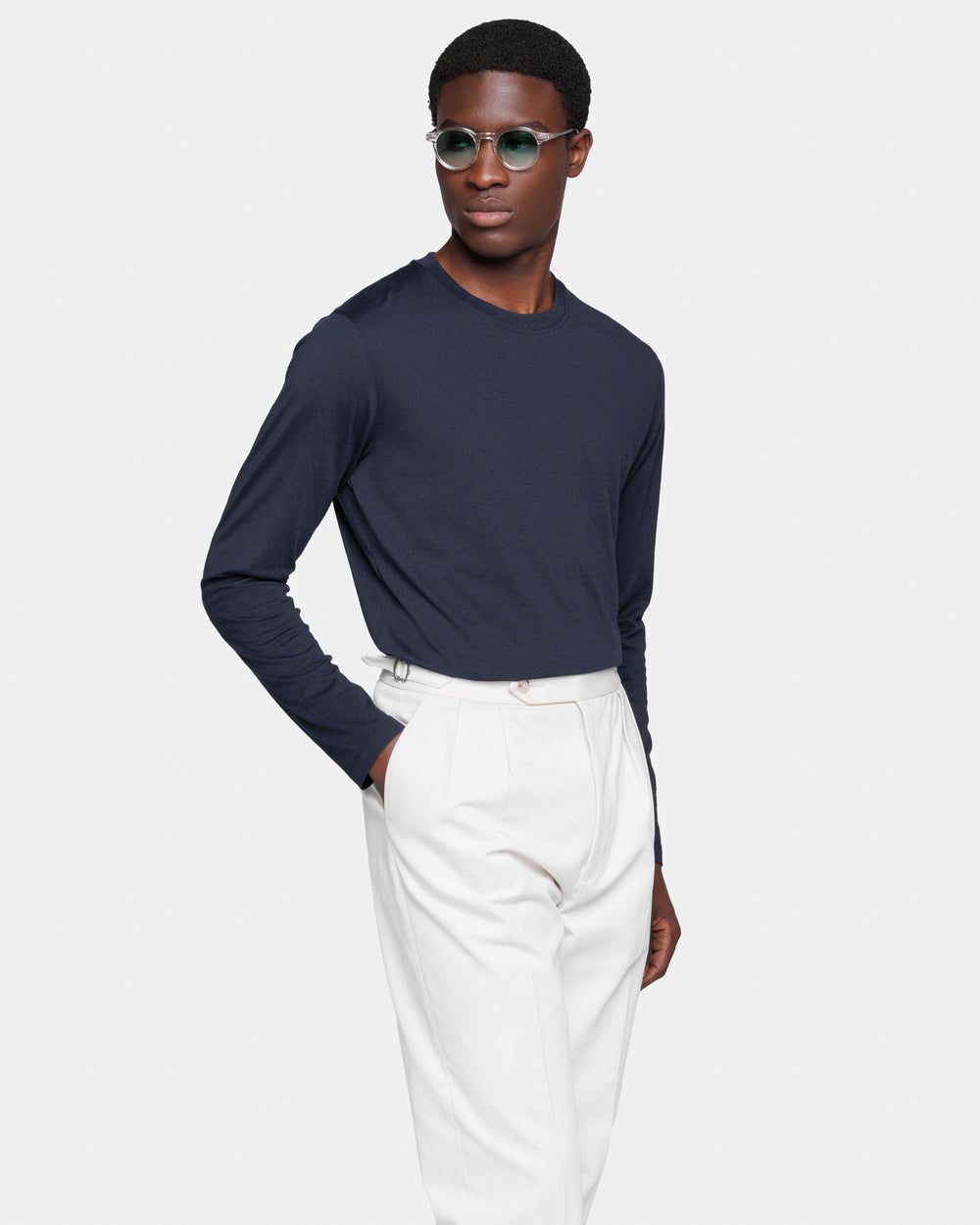 Een t-shirt met lange mouwen is een uitstekende basis voor een ontspannen stijl.