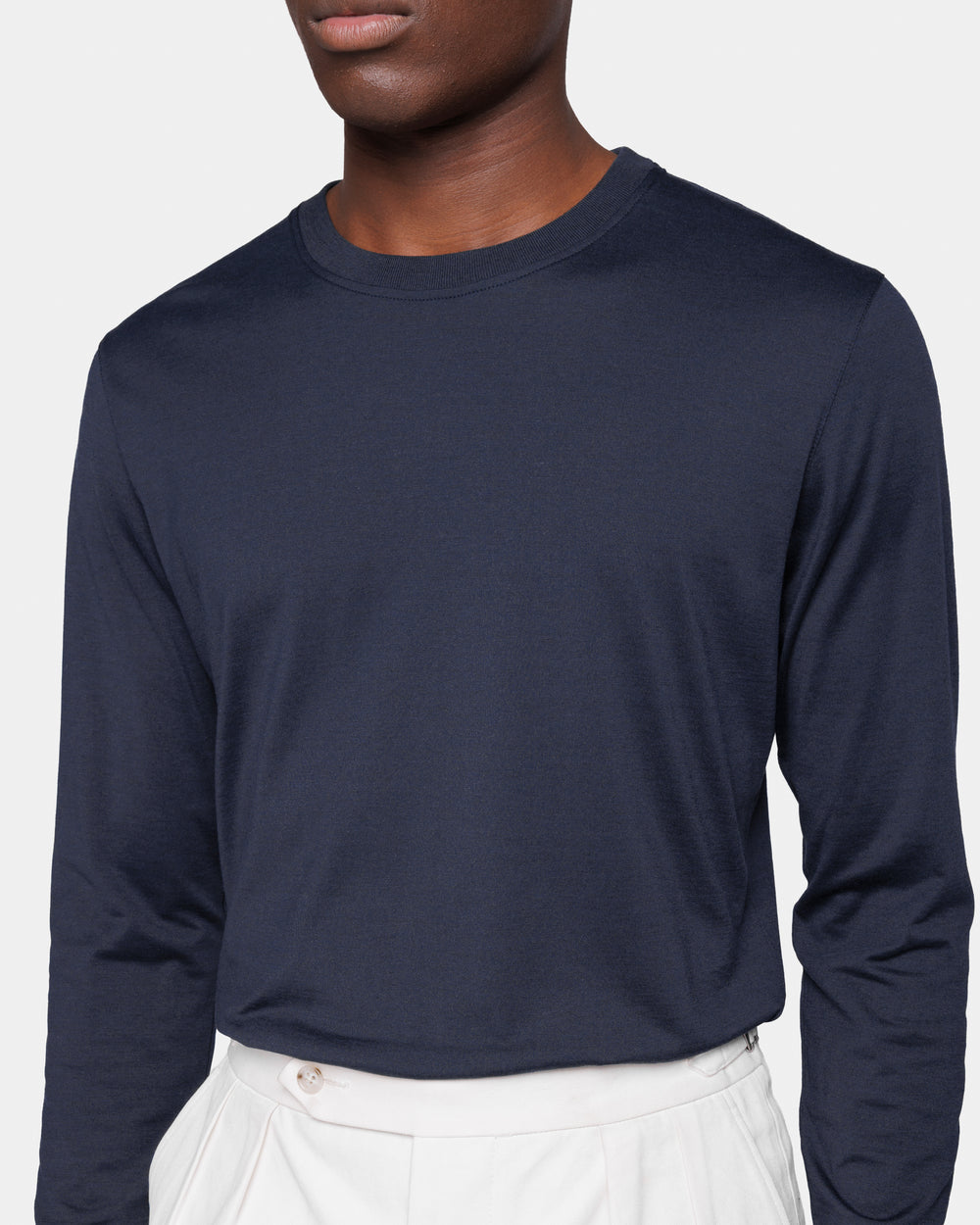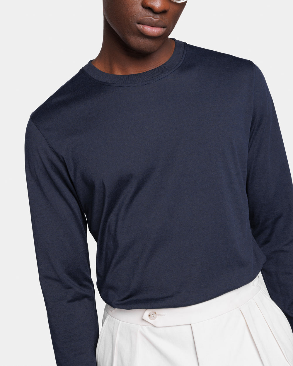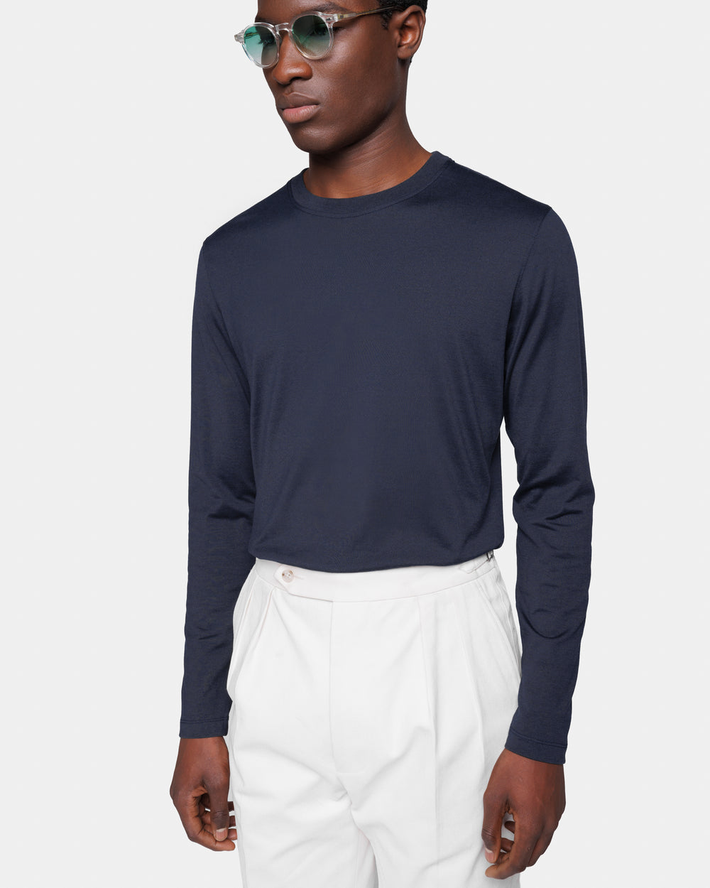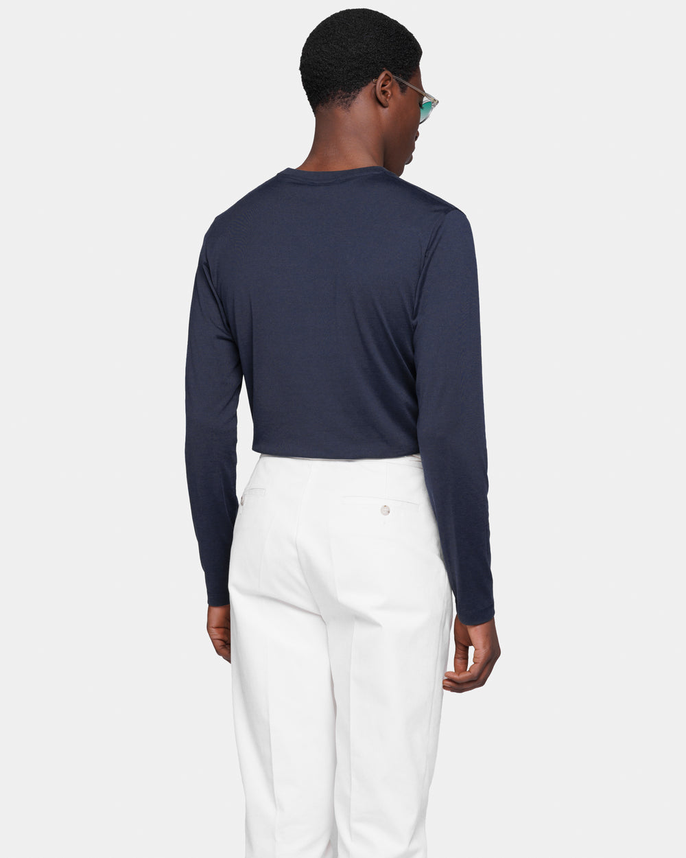Gemaakt van een luxueuze mix van jersey 2/115.000 van 60% Mulberry zijde en 40% biologisch katoen, gebreid op een fijnheid 28 machine, in de kleur blauw van de Italiaanse weverij Maglificio Maggia, heeft het een uitzonderlijk zachte textuur en een semi-matte uitstraling. Het combineert de frisheid van katoen met de lichtheid en glans van zijde, wat de zomerse sferen van verre eilanden en de ontspannen geest van onze collecties oproept.